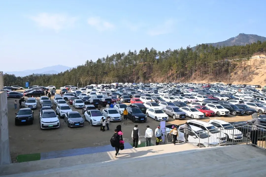 桃花冲国际滑雪场停车场爆满,车辆整齐摆放