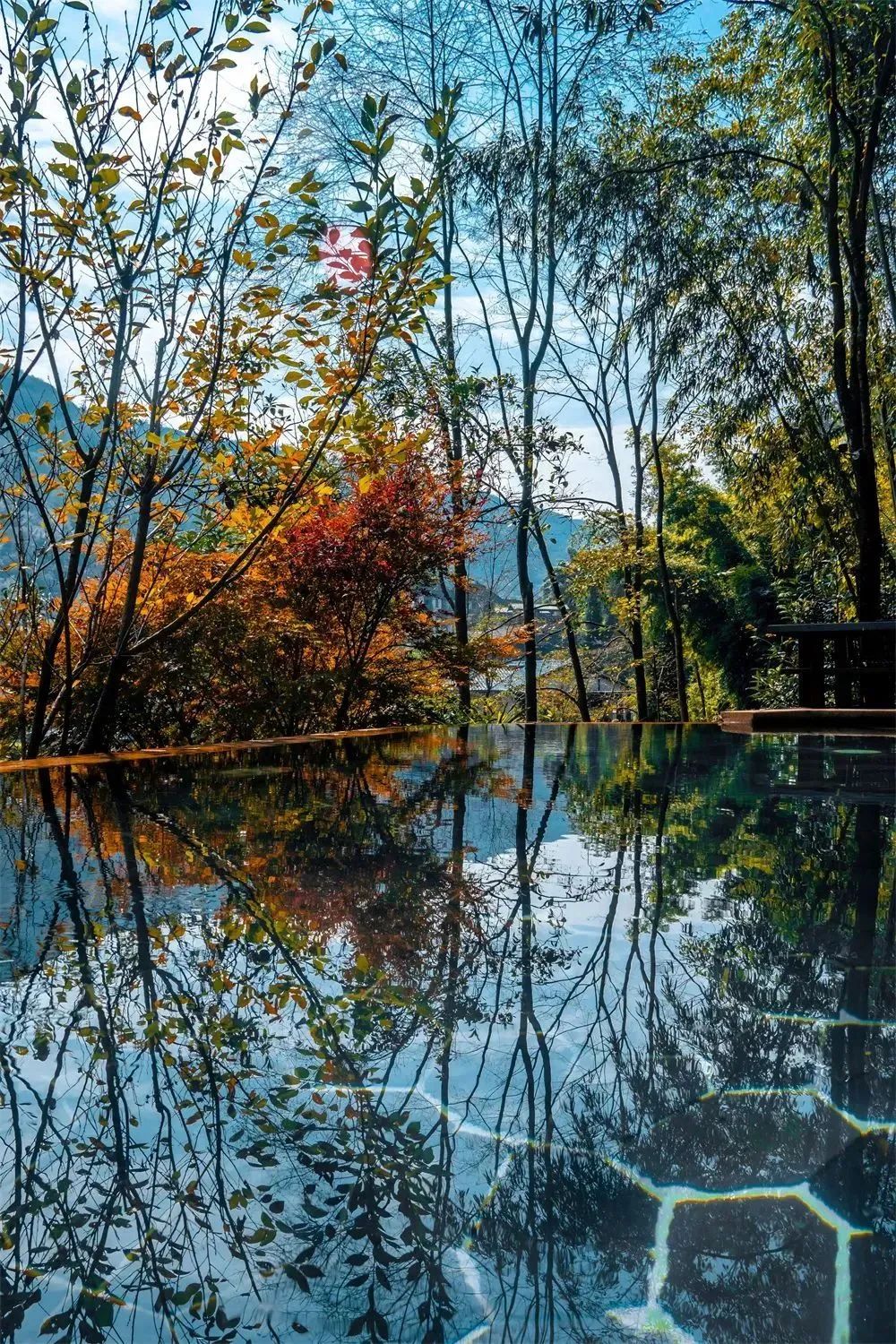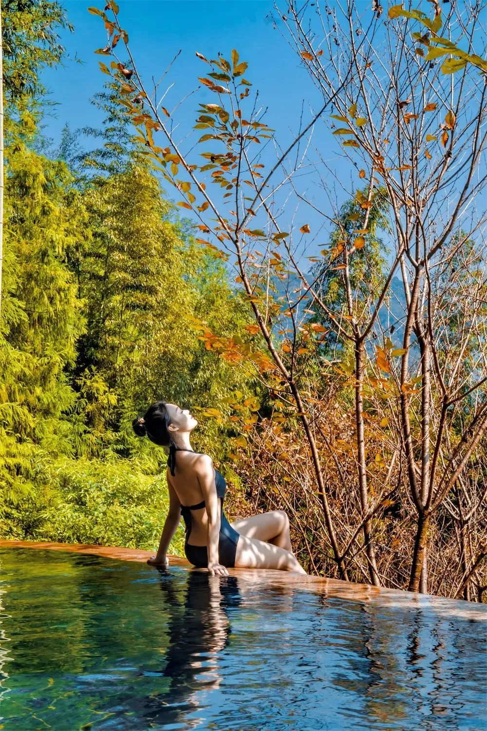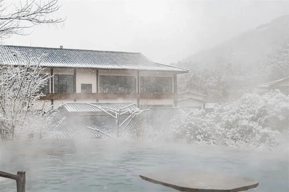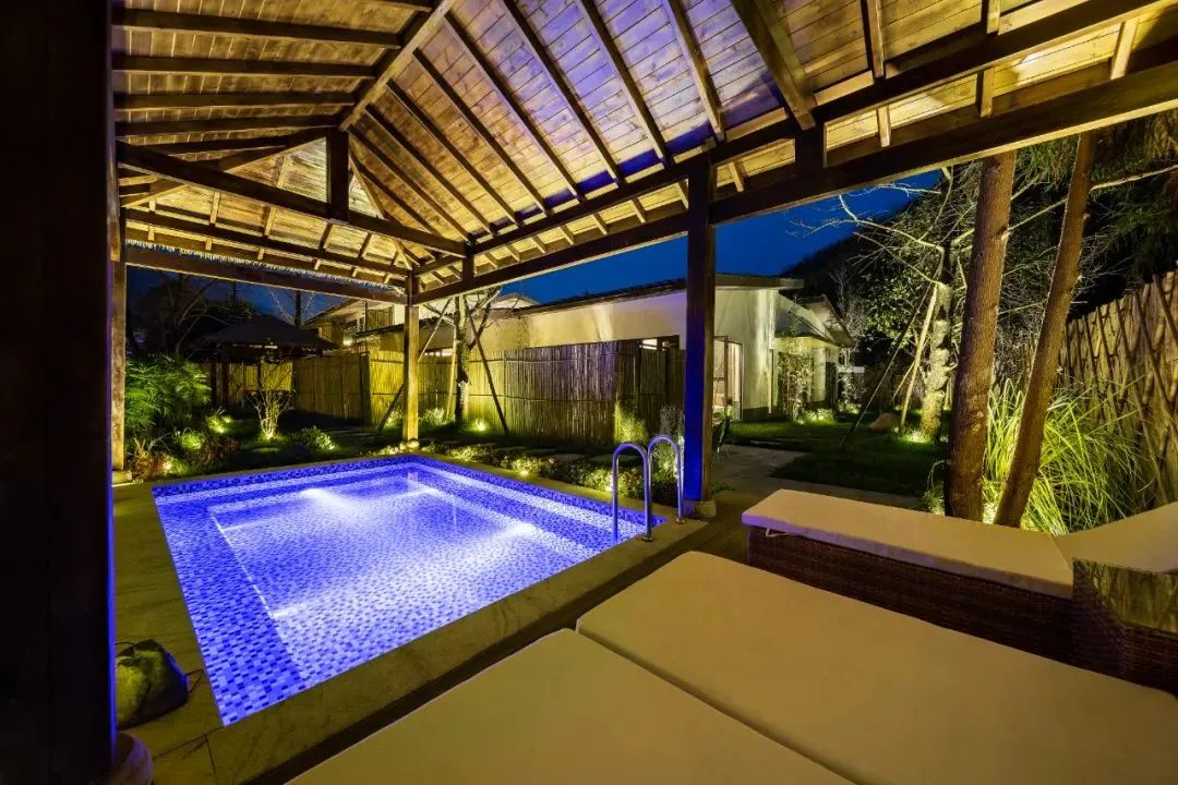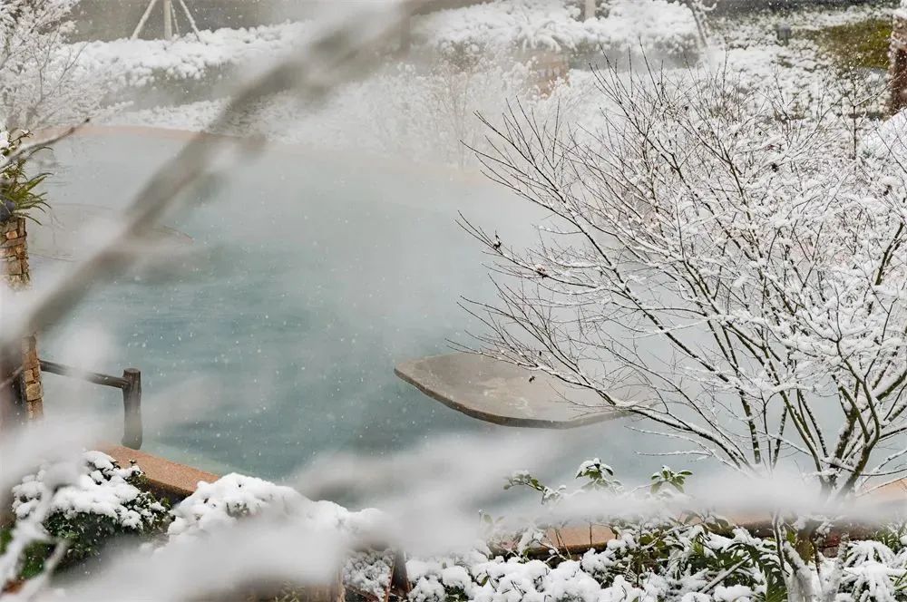四合院自配的私汤,紧邻河景,一片宽阔,偌大的私汤池子,七八人也是容得下的,算得上是“泳池”了。