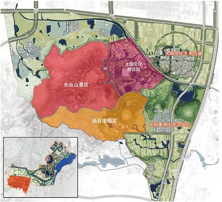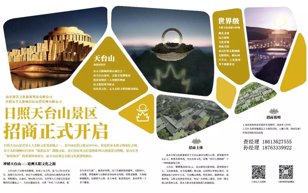 天台山旅游区是东方太阳城的核心项目之一,由天台山景区、太阳文化博览园、汤谷度假区三大功能区构成。天台山旅游区是以太阳崇拜为原点,以东夷文化、五大太阳文明体验为核心,由瞻礼圣境、远古秘境、文化奇境、体验圣境为吸引物构成的一处世界级太阳文化旅游目的地,以山海格局为建设基础,内容重点打造包括太阳神殿、太阳祭坛、财山祠、日月山、三官殿等在内的多个旅游景点。天台山景区一期项目划开放:天台山、流水天街、太阳客栈、游客服务中心等。