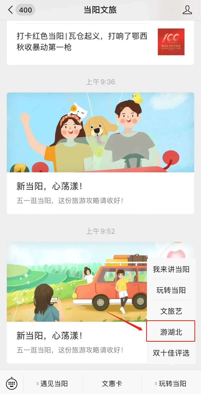 2、在「当阳文旅」微信公众号右下角选择「玩转当阳」-「游湖北」进入预约平台。