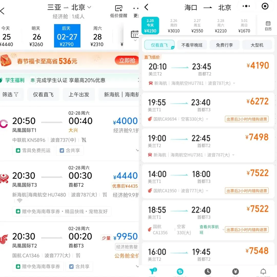 海口—北京的返程机票价格也出现回落。去哪儿旅行小程序显示,2月25日海口—北京的最低票价为4190元,公务舱还有6000—7000元的6.4折、7.5折等折扣机票在售。2月26日和27日,海口—北京的最低票价分别降至3783元和3157元。