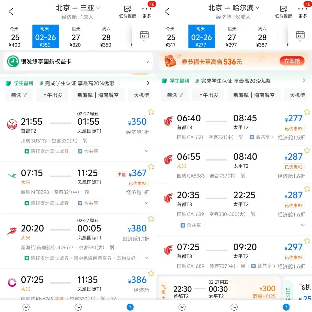 北京—哈尔滨、北京—北海等热门旅游航线票价也出现显著下降。其中,北京—哈尔滨2月26日的机票低至277元,远低于同日552元的高铁二等座。