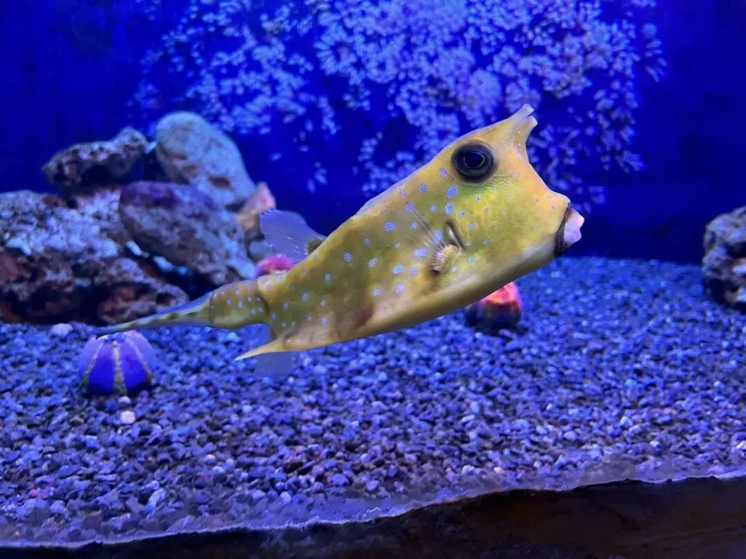 图:牛角箱鲀,鱼尾后面的生物是蓝礼服海胆