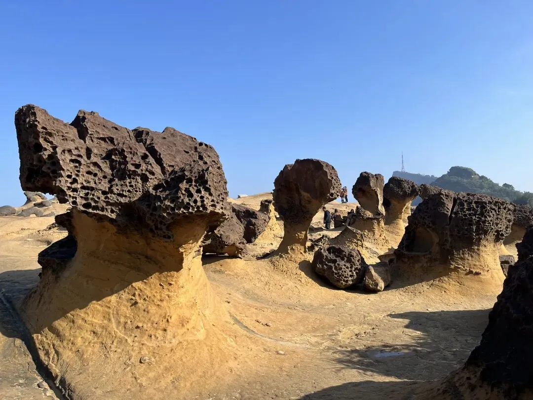 野柳海岸岬角区共分为三大区域,第一区有多样且造型奇特的蕈(xùn)状岩、烛台石,在这里可以看到蕈状岩的发育过程。