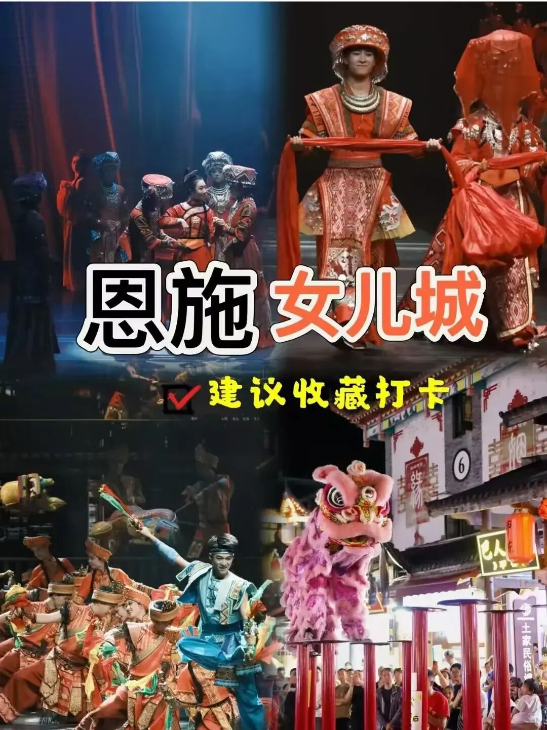 国家AAAA级景区:恩施土家女儿城 是全国土家族文化集聚地,也是未来武陵地区城市娱乐消费中天下女儿第一城之称的国心和旅游集散地,旨在打造中国西部首家文化旅游商业古镇、中国的相亲之都。
