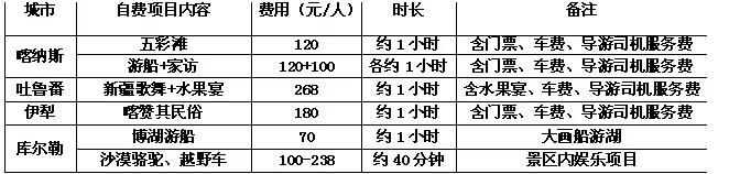为保证行程的严谨性、准确性,并为了您的旅途愉快以及维护您的合法权益,且不给您带来不必要麻烦及损失,同时为了保证您在旅途上度过一个愉快的假期,我们将您所参加游览行程涉及到的景区景点内的自费、购物、自理项目等情况为您做一个详细告知。 对旅游行程单(我公司专用旅游行程表)中约定的自由活动期间的行程安排,我们应提前告知旅游者,保证游客的知情权,并经双方协商一致,作为旅游合同的组成部分。以下自费项目为提前告知您,属自愿、自费并提前知晓的活动项目,当地导游及旅行社不会强买、强卖更不会强迫消费,这是您的自由,也是您的合法权益,具体明细如下: 一、自费(另付费)项目告知: