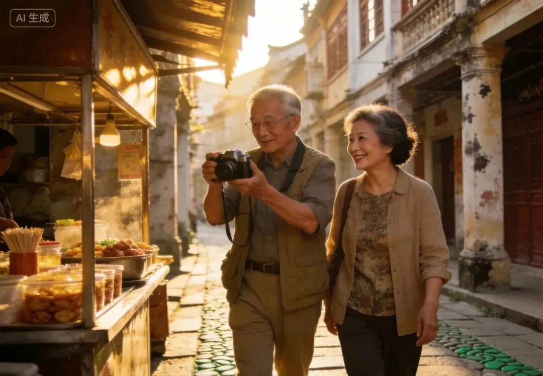 老刘在潮汕古城里慢慢走着,阳光透过古老的屋檐洒在地上。他说:“年轻时为工作忙,为家庭忙,现在终于可以为自己活了。”