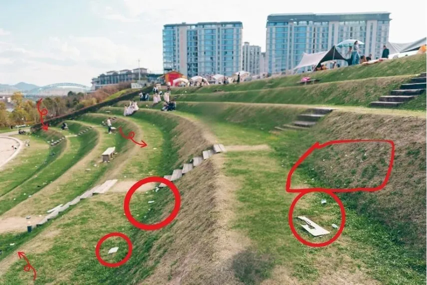 可这份美好,却被草地边、步道旁遗留的大量垃圾打了折扣。零食包装袋、饮料瓶、纸巾散落各处,与周围的青翠草木格格不入,既破坏了视觉美感,也给景区环境增添了负担,让人不免心生惋惜。