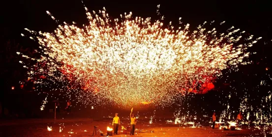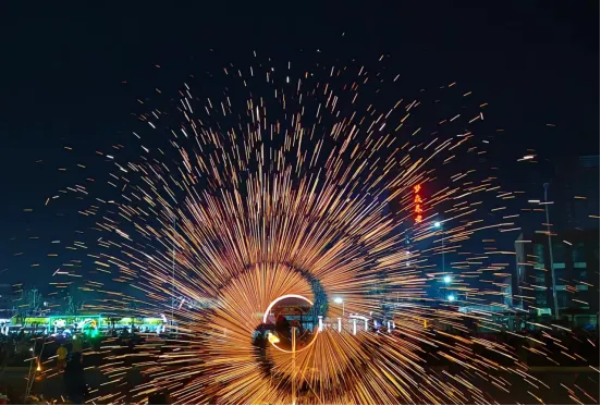 3、打铁花+非遗风火轮:经典非遗项目持续加码,漫天铁花与流转火光交织,夜晚的景区被装点得如梦似幻,氛围感直接拉满。