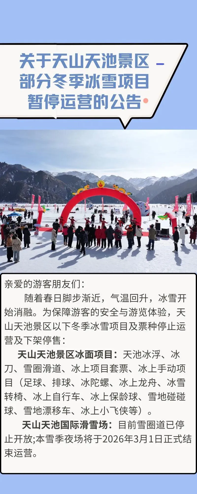 您现在的位置是:首页 > 国内旅游目的推荐 > 正文 国内旅游目的推荐 关于天山天池景区部分冬季冰雪项目暂停运营的公告 admin2026年02月25日 18:28:46国内旅游目的推荐9 关于天山天池景区部分冬季冰雪项目暂停运营的公告↓↓温馨提醒1.冰上电动项目正常运营。2.已购买上述项目票券的游客,可通过原购票渠道办理退票或咨询景区服务热线。 3.冰雪会融化,但美好不会。天山天池景区将持续优化春季游览产品,陆续推出踏青、赏花、徒步等春季特色活动,敬请关注官方最新公告。 感谢您的理解与支持,期待与您在春日天山天池再次相遇! 官方客服热线:400-8706-110 特此公告。 新疆天池管理委员会 2026年2月25END来源:新疆天池管理委员会 编辑 /哈斯得尔 责编 /廖先勤 监审 /王 琪 转载请说明来源于"旅荐网",部分内容转载自网络,如有侵权请联系qlwl@foxmail.com删除 本文地址:https://www.15386.cn/post/123430.html 上一篇 JS01 宜兴◆网红窑湖小镇◆玉女潭-景区内酒店◆纯玩4日游399元◆3早6正餐,山水养心,文脉养性,免费棋牌KTV! 下一篇 来三峡坐船旅游的人太多了,又有新船即将首航 相关文章 周末周边行,央视热播剧取景!老友记们的游玩攻略来了! 《“十五五”文化和旅游发展规划》四大编制使命 新能源车出游指南:老司机的10个实用建议 腾冲四季旅行攻略:本地人带你玩转极边第一城 2026年春节去大理旅游地图路线攻略看过来 山西晋城五天四晚小众路线旅游攻略 旅行攻略 | 赴一场春日的幸运之约(文末含兑换码) 腾冲四季旅行攻略:本地人带你玩转极边第一城 3-5\7️福建旅游攻略已做好!姐妹们码住 越南清化省海进海滩超详细旅行攻略 发表评论 取消回复 评论列表 这篇文章还没有收到评论,赶紧来抢沙发吧~