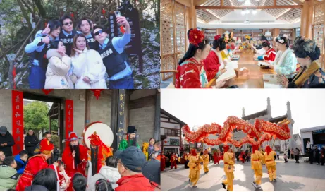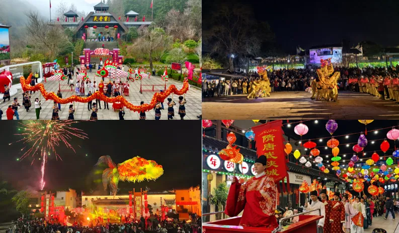 集团所属各景区围绕文旅融合持续创新,充分挖掘在地文化,深度融合传统民俗韵味与潮流时尚元素,打造沉浸式体验、特色市集、主题业态、非遗演艺等多元消费场景,让广大游客变“观光游”为“体验游”。天堂寨景区18款特色文旅活动全天候轮番上演,让游客在青山云海间迎接新年好兆头,男团快闪、古风侠影、冰雪精灵NPC随机现身,“化鱼成龙”夜游巡演每晚吸引近万人次游客参与。桃花潭景区踏歌古岸非遗双滚龙表演、烟花秀精彩纷呈,吸引广大游客争相打卡,AI导游让广大游客与诗仙“李小白”同游共赏。唐模景区“满池娇·独占鳌头”表演与徽州鱼灯巡游梦幻联动,点燃新春夜空,活动火爆出圈,登顶抖音热榜,获央视新闻联播关注播报,全网视频播放量逾5000万次。隋唐运河古镇聚焦隋唐古乐、打铁花、鱼灯汉服等非遗、民俗,融合北极光灯光秀、飞天凤凰等时尚元素,奉献了精彩绝伦的迎新春文旅盛宴。