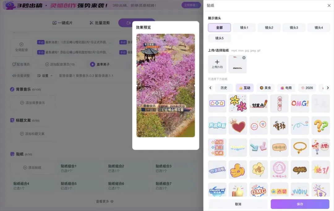 针对樱花园从筹备到开园、花期播报、新春福利的不同营销阶段,小魔推的灵活剪辑模式支持商家随时更换素材、调整文案与口播内容,让内容始终与营销重点同频。比如预热阶段重点突出“即将开园、预约通道开启”,花期播报阶段重点展示“樱花盛放实景、最佳赏樱时段”,新春福利阶段重点强调“门票折扣、打卡送好礼”,通过内容的动态更新,精准适配不同阶段的营销重点,让每一条内容都能发挥最大传播价值。