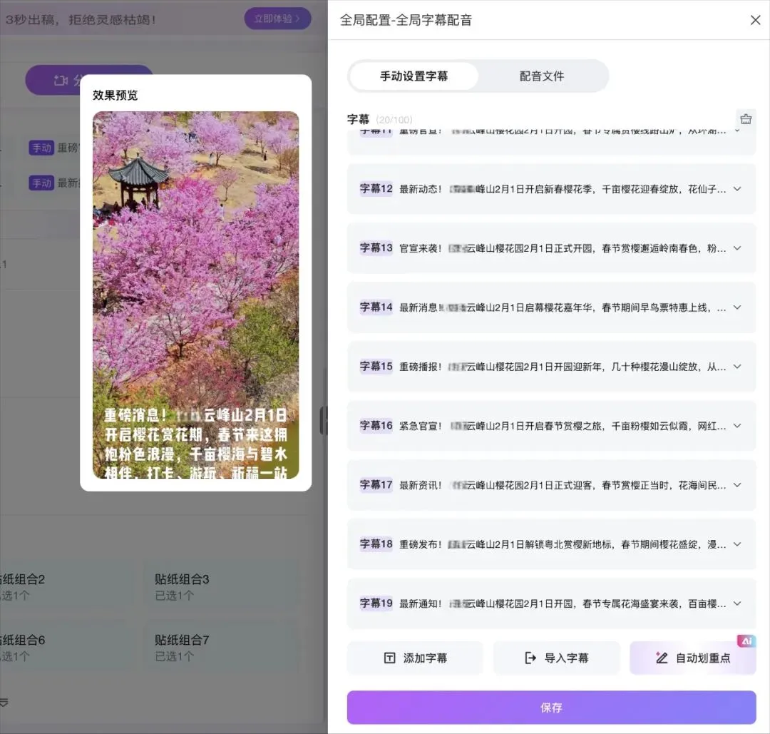 云峰山樱花园视频中“大景+细节”的灵活搭配,正是依托小魔推的分镜剪辑功能实现。商家可通过该功能自定义镜头顺序、时长、转场效果,比如先放樱花园全景航拍吸引用户注意力,再无缝切换到樱花特写、游客互动细节,层层递进,增强视频的观赏性;同时功能支持口播与画面精准匹配,比如说到“百亩樱花”时同步展示全景画面,说到“全家出行”时展示游客家庭互动场景,让内容逻辑更清晰,用户代入感更强。