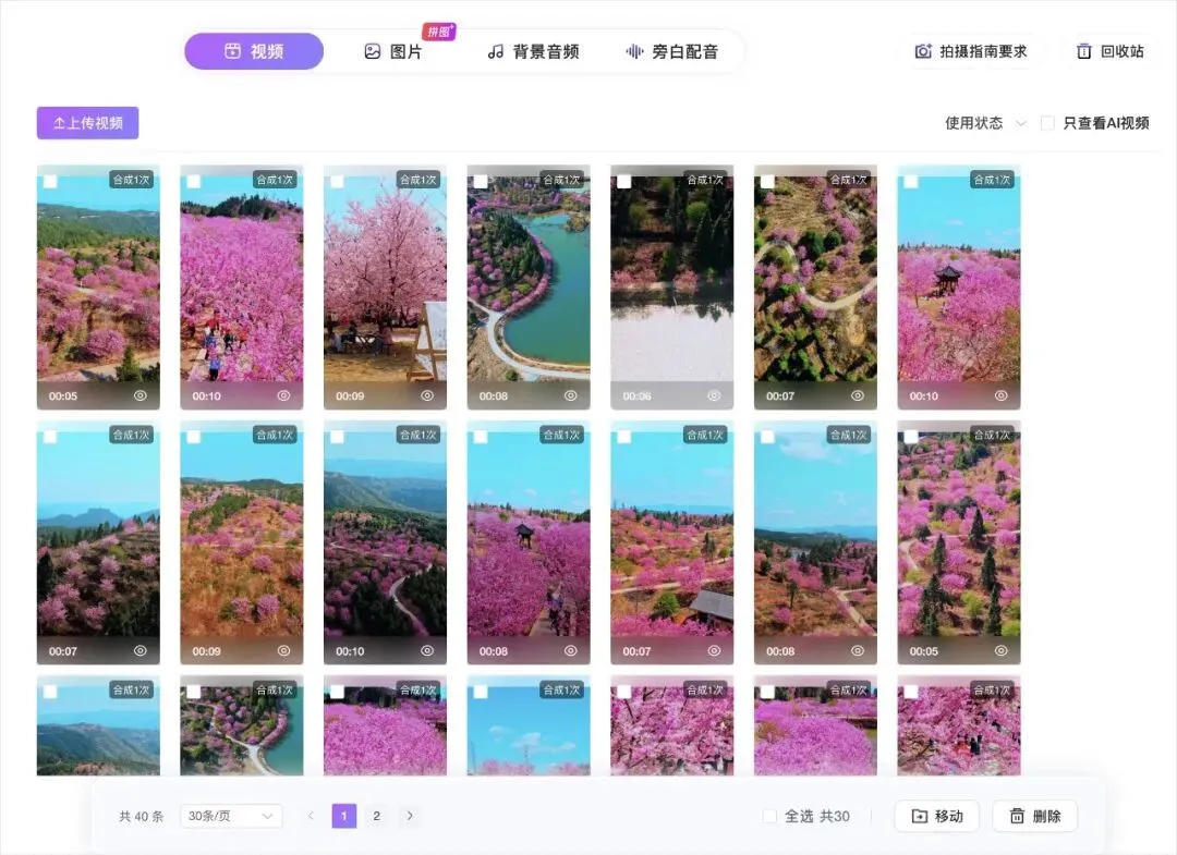 内容同质化是景区短视频营销的一大痛点,云峰山樱花园通过动态化的素材运营策略,完美解决了这一问题。景区始终保持素材库动态更新,素材总量稳定在≥250条的水平,素材内容覆盖樱花园全景航拍、樱花特写、游客打卡互动、园区配套设施等多个维度,为内容创作提供了丰富的素材支撑。