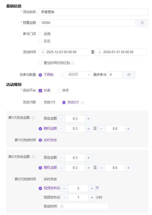 在成本控制层面,商家可在后台自主设置总预算、单次红包金额、活动时间、参与次数等关键参数,既能保证营销活动的吸引力,又能有效避免营销成本超支,同时防止个别用户的“薅羊毛”行为,让景区营销的每一分投入都能发挥最大价值。