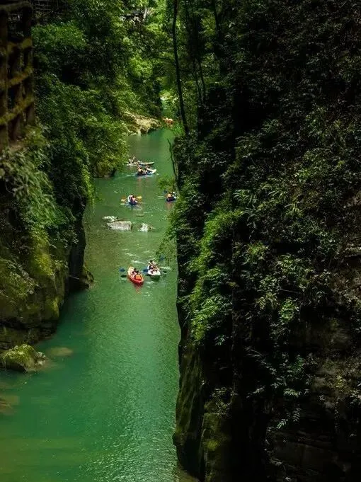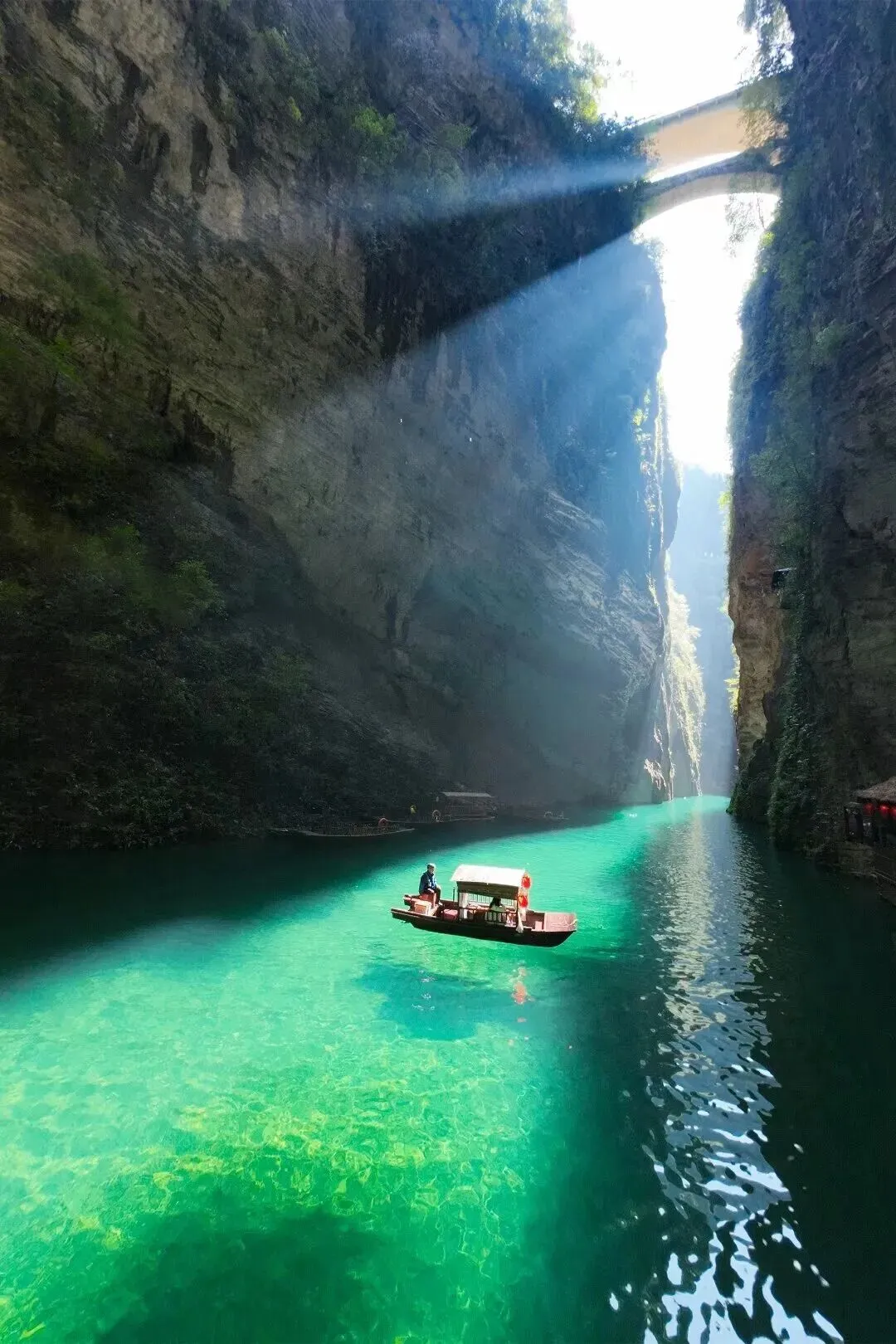 屏山峡谷形成于三叠纪 / 第四纪冰川时期,以极致清澈的河水与悬浮船闻名,河水透明度极高,木船行驶其上,宛如悬浮于浩瀚宇宙之间,空灵而美丽!
