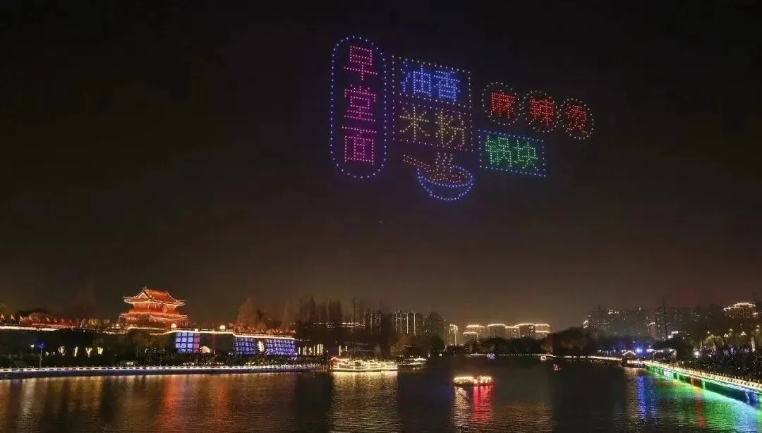 荆州千架无人机“凤舞九天”,演绎“赤黄红”英雄印记。