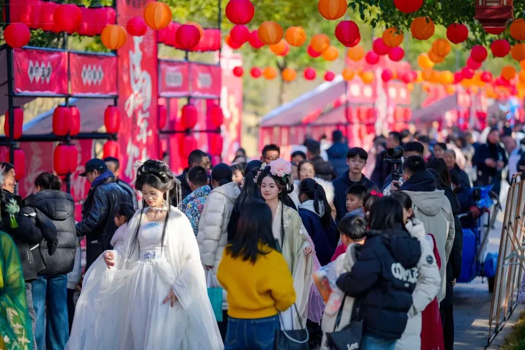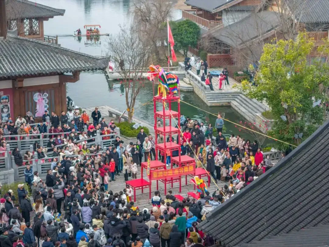荆门明显陵文化旅游景区.莫愁村洋溢着浓厚的节日氛围,非遗民俗表演吸引众多游客围观。
