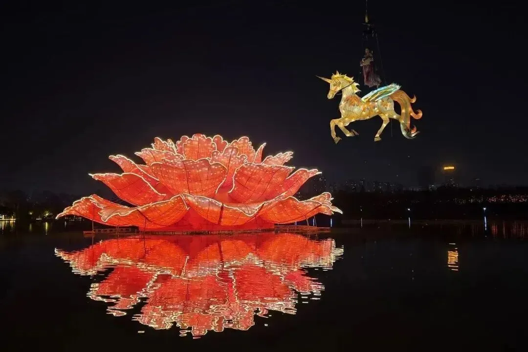 以 “王城驰骏・千乘迎春” 为主题,80组大型灯组错落分布,山河跃影、焕彩云章、千载华光、哒哒未来城四大区域各有韵味。骏马奔腾、牡丹盛放的灯组,将河洛文脉与国潮科技完美融合,一步一景,满目惊艳,随手一拍都是国风大片。