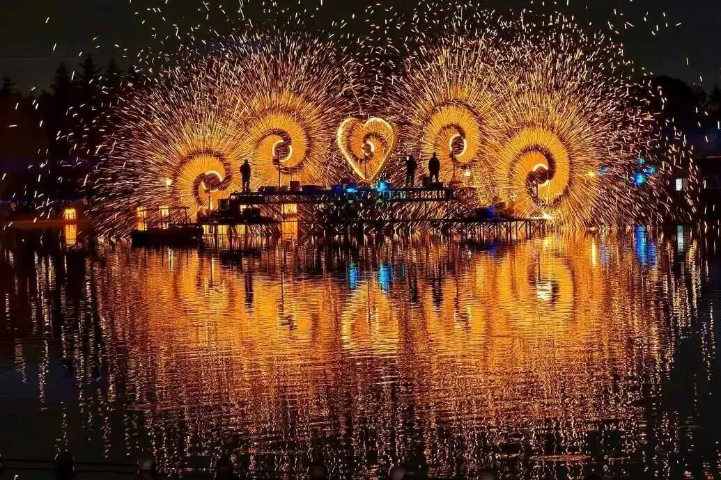 这里不仅有 “花市灯如昼” 的诗意,更有水上打铁花的震撼 ——1600℃的铁水被抛向高空,瞬间绽放成漫天星河。还有变脸、杂技、火壶表演全天轮演,逛累了再去美食市集打卡,一站式解锁吃喝玩乐。