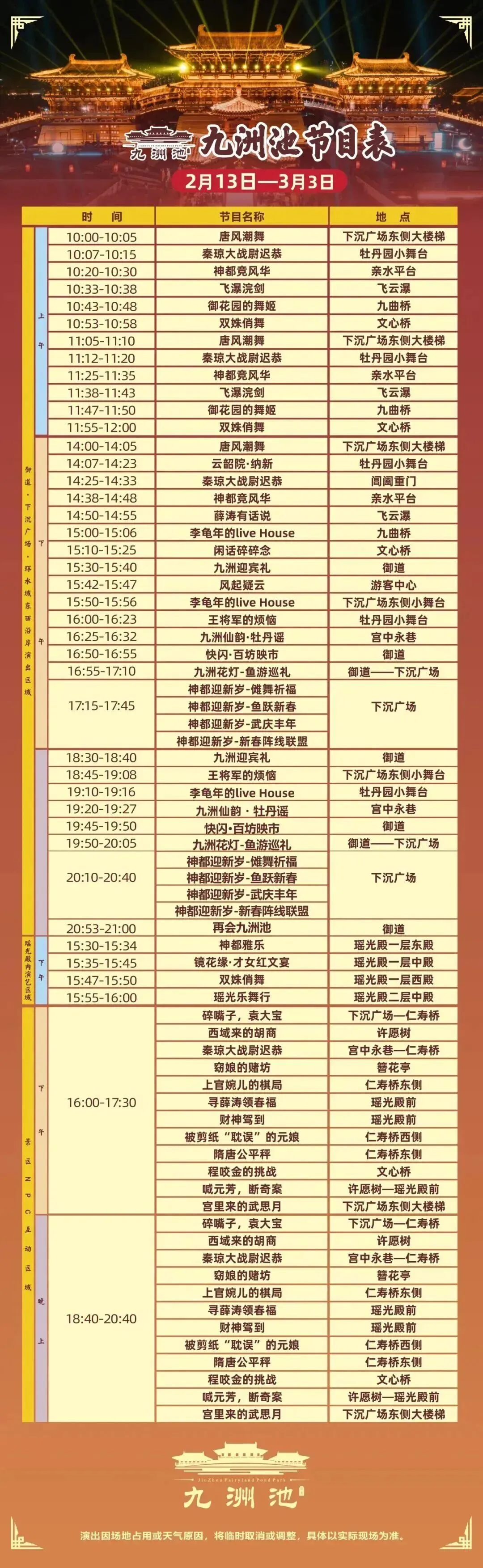 全天不间断的唐风演艺让人一秒入戏,唐风潮舞、秦琼大战尉迟恭、飞瀑浣剑等节目精彩连连;李龟年的live House演绎古乐新声,九洲迎宾礼再现皇家威仪。