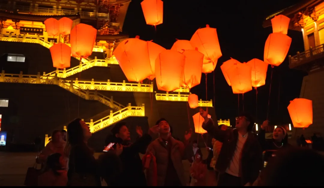 古都春至,千灯映阁✨洛阳牡丹阁千灯祈福嘉年华活动持续至3月3日,千盏电子孔明灯共赴星河,祈福廊风铃轻扬,系一缕心愿寄往新春;光影演艺轮番登场,NPC 巡游、灯光秀点亮古都夜晚。