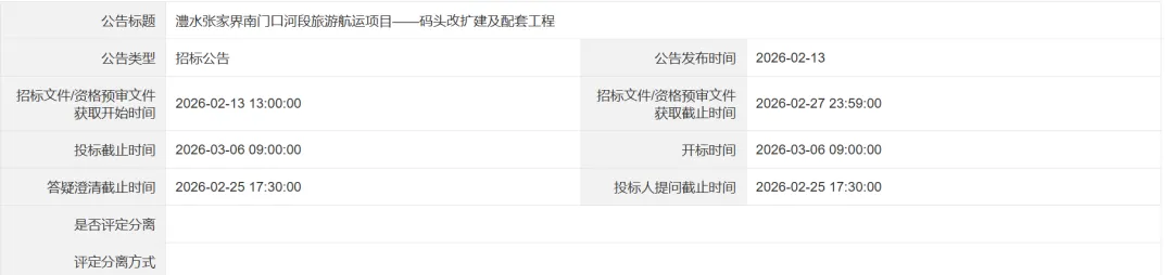 本招标项目澧水张家界南门口河段旅游航运项目——码头改扩建及配套工程已由张家界市发展和改革委员会(项目审批、核准或备案机关名称)以张家界市发展和改革委员会关于澧水红壁岩电站--木龙滩电站航运项目可行性研究报告的批复、张家界市发展和改革委员会关于变更澧水红壁岩电站一木龙滩电站航运项目立项名称的批复,张发改审批[2025]39号、张发改审批[2026]10号(批文名称及编号)批准建设,项目业主为张家界城市运营发展集团有限公司,建设资金来自财政,项目出资比例为:国有资金:100 %,招标人为张家界城市运营发展集团有限公司,招标代理机构为:张家界方正建设项目管理有限公司,项目已具备招标条件,现对该项目的施工进行公开招标。