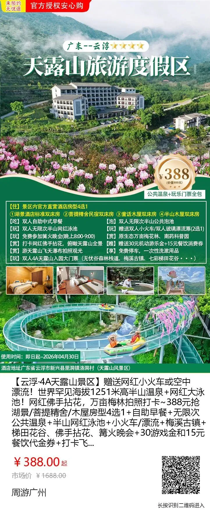 爆低价!388元云浮天露山景区酒店+双早+无限次半山温泉+篝火晚会+小火车/玻璃漂流,打卡佛手拈花