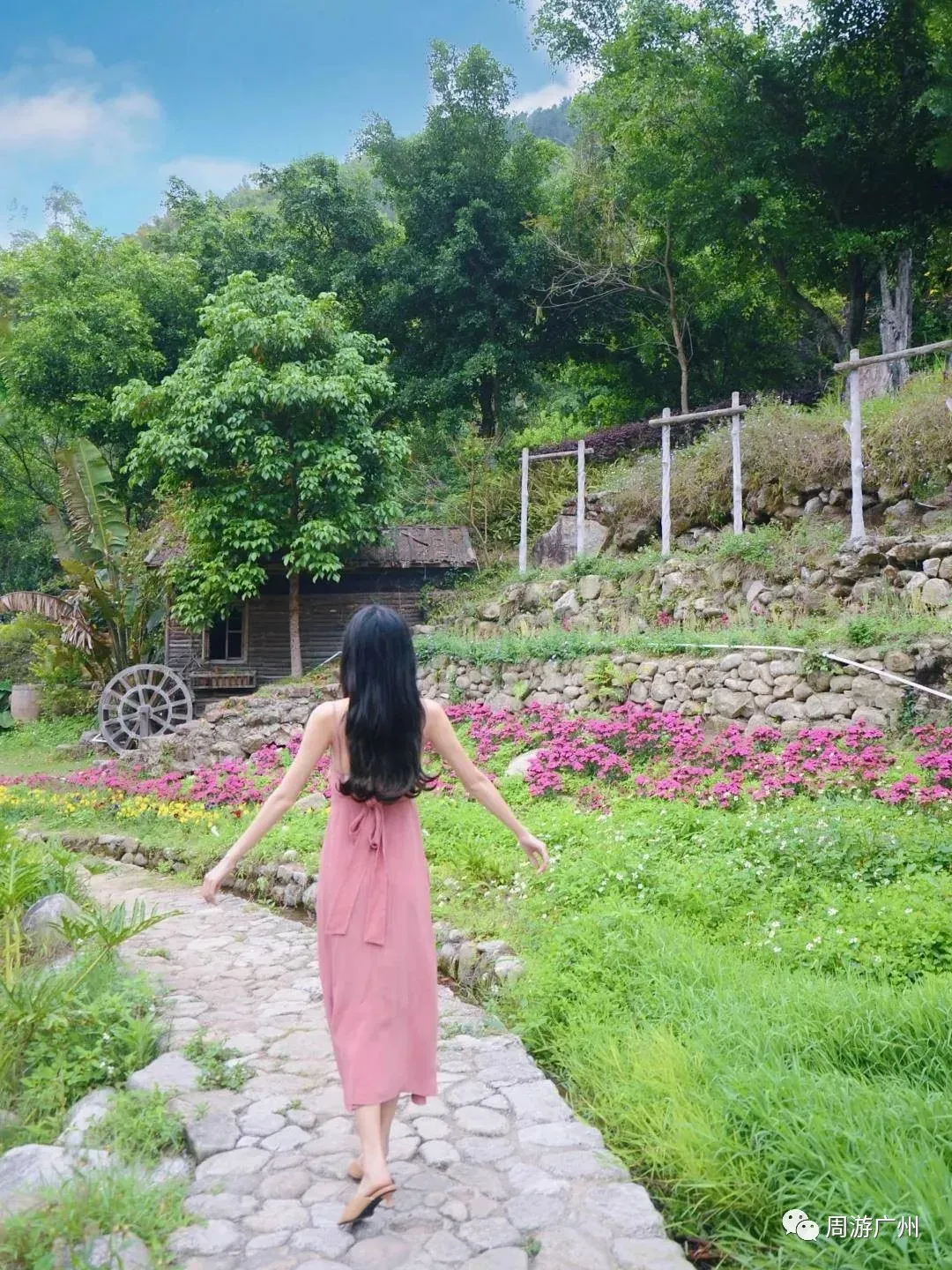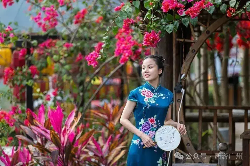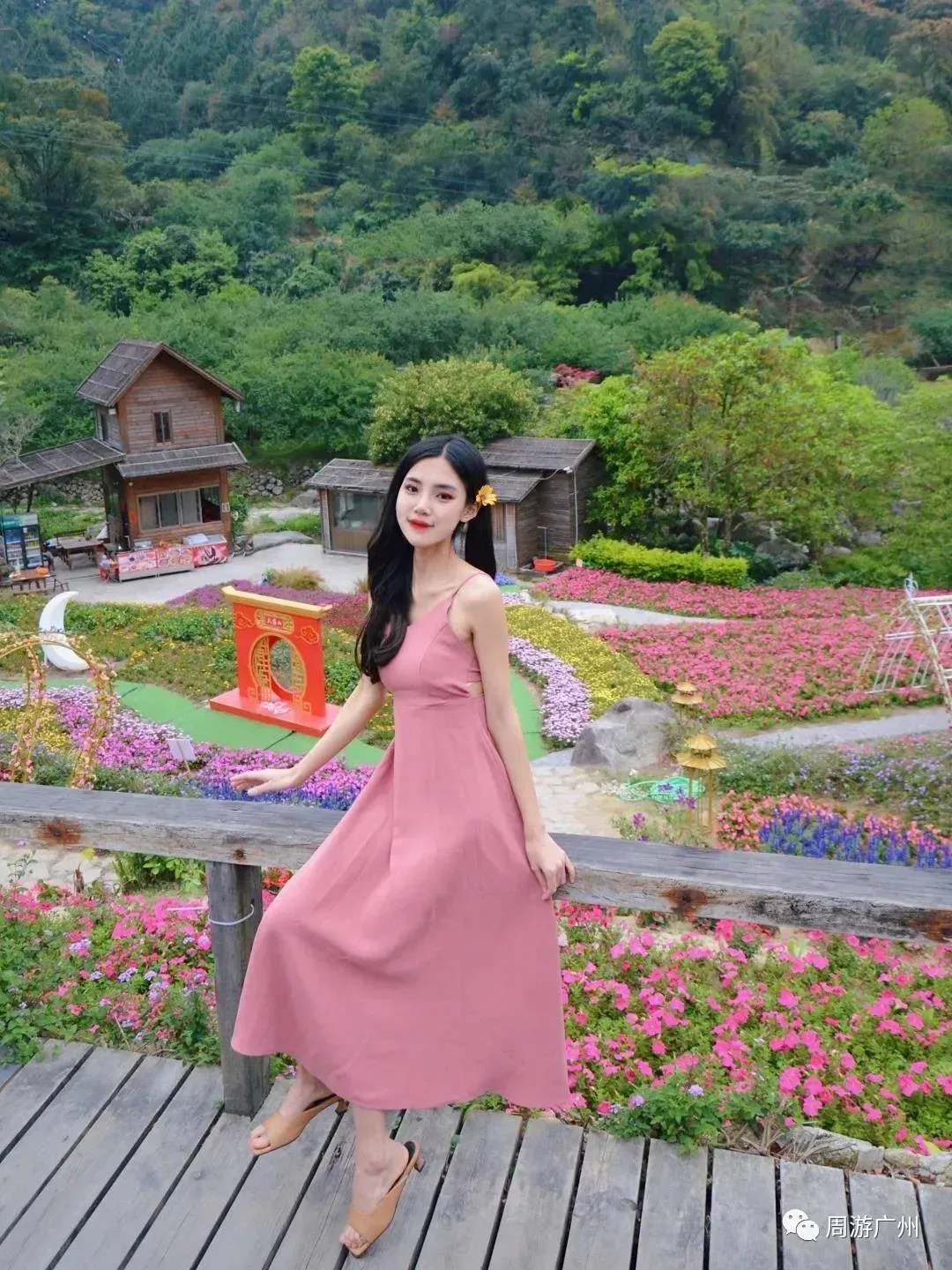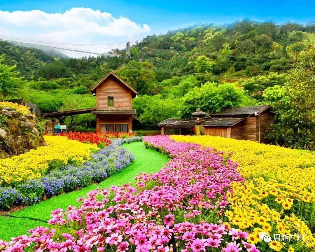 在梅溪古镇前,一片姹紫嫣红的花谷