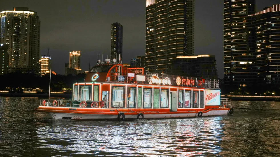 珠江夜游以江为弦、以船为歌,以流动的红色课堂致敬百年工运精神。主题船外观以“让历史随波流淌,让精神薪火相传”为核心理念,船体的主色调采用了象征革命热情的橙红色与象征工人阶级力量与沉稳的杏色。