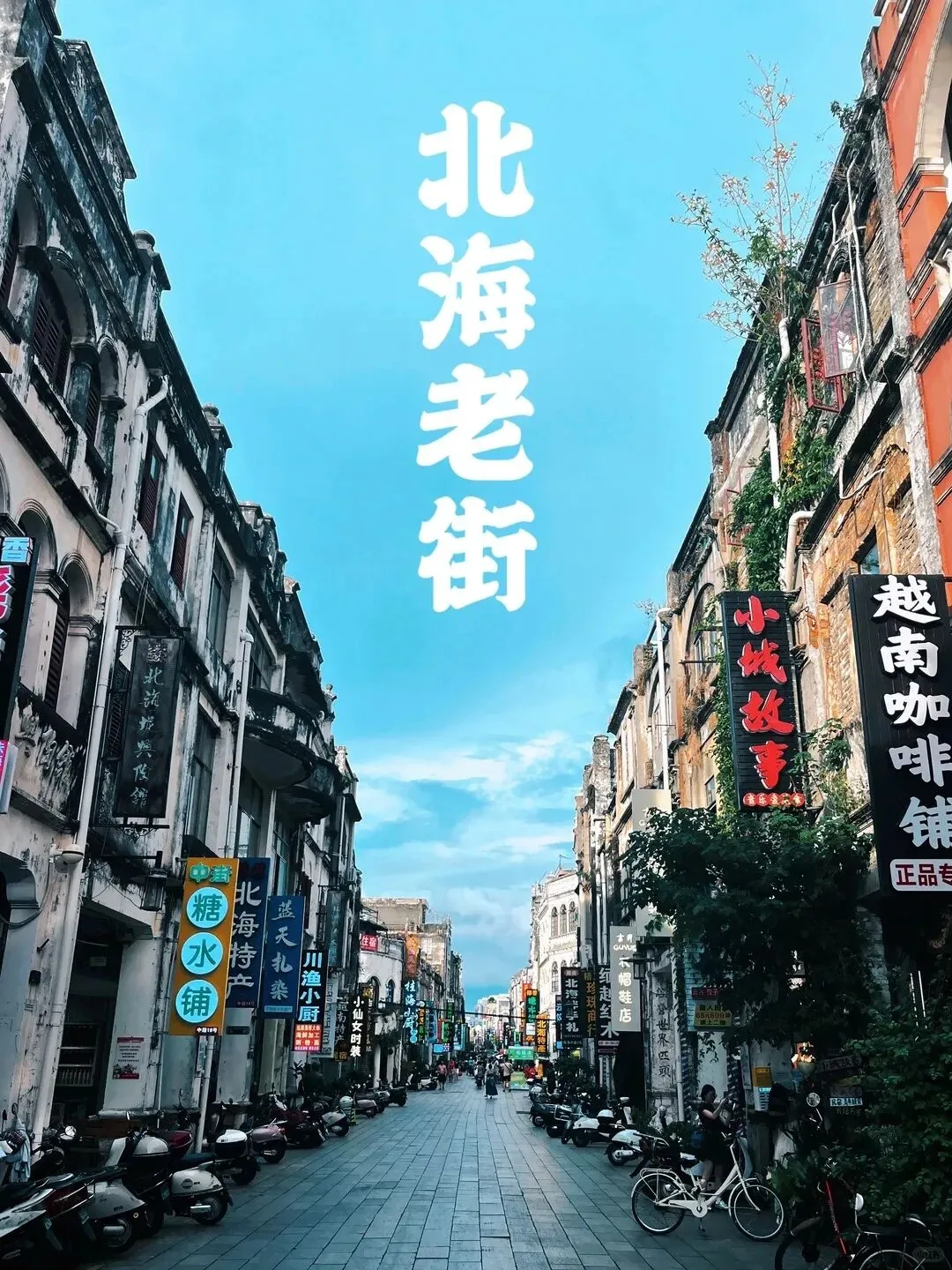 始建于 1821 年,是中国岭南地区直线最长、保存最完好的骑楼老街之一。建筑多为二至三层中西合璧的骑楼,斑驳墙面、精致雕花、罗马柱与岭南青砖混搭,见证了清末民初北海开埠后的商贸繁华;如今街上有虾饼等老字号小吃、手工艺品店、咖啡馆,充满复古市井气息。