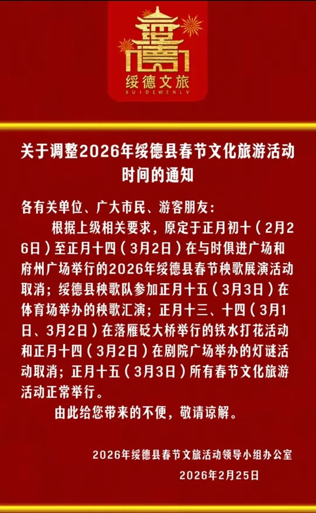 根据上级相关要求,原定于正月初十(2月26日)至正月十四(3月2日)在与时俱进广场和府州广场举行的2026年绥德县春节秧歌展演活动取消;绥德县秧歌队参加正月十五(3月3日)在体育场举办的秧歌汇演;正月十三、十四(3月1日、3月2日)在落雁砭大桥举行的铁水打花活动和正月十四(3月2日)在剧院广场举办的灯谜活动取消;正月十五(3月3日)所有春节文化旅游活动正常举行。(点图放大查看)
