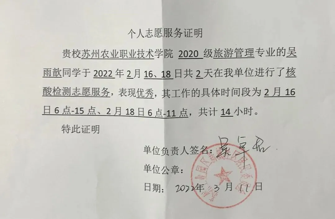 新冠疫情的爆发,苏州全市进入警戒。各行各业的干部群众投入到抗疫一线。作为一名大学生,我觉得有必要在这个时候站出来做一名志愿者。我的工作是维持好群众做核酸的秩序,检测温度,查看健康码以及配合医护人员工作。作为一名志愿者我很自豪,我们终将战胜疫情,苏州加油。