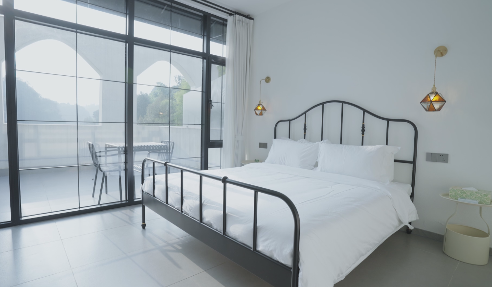 它是一座具有希腊圣托里尼风格的白色建筑,整个环境简静安然,与世无争。阳光下的它,白得那么皎洁、耀眼,让人有一种时空穿越的错觉,纯白色弧形楼梯给人无尽的想象,从不同的角度看会有不一样的感受,旁边精致的景观树搭配,非常吸睛,很容易出片。民宿共设有7间客房,整体设计风格简洁淡雅,有着浓浓的北欧风,温馨而不失格调,留白产生的余味,让每个角落都是一张杂志内页。民宿的美食也很受欢迎,口水鸡、酸菜鱼、土鸡汤锅等特色美食,所有食材来源天然,追寻本味,质朴清新。