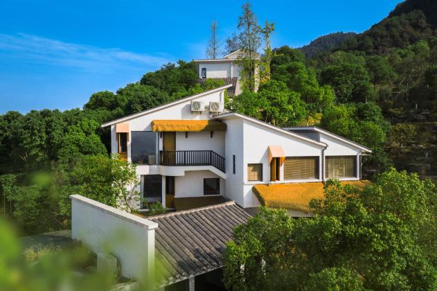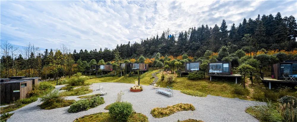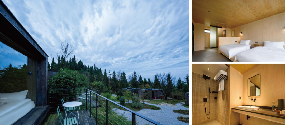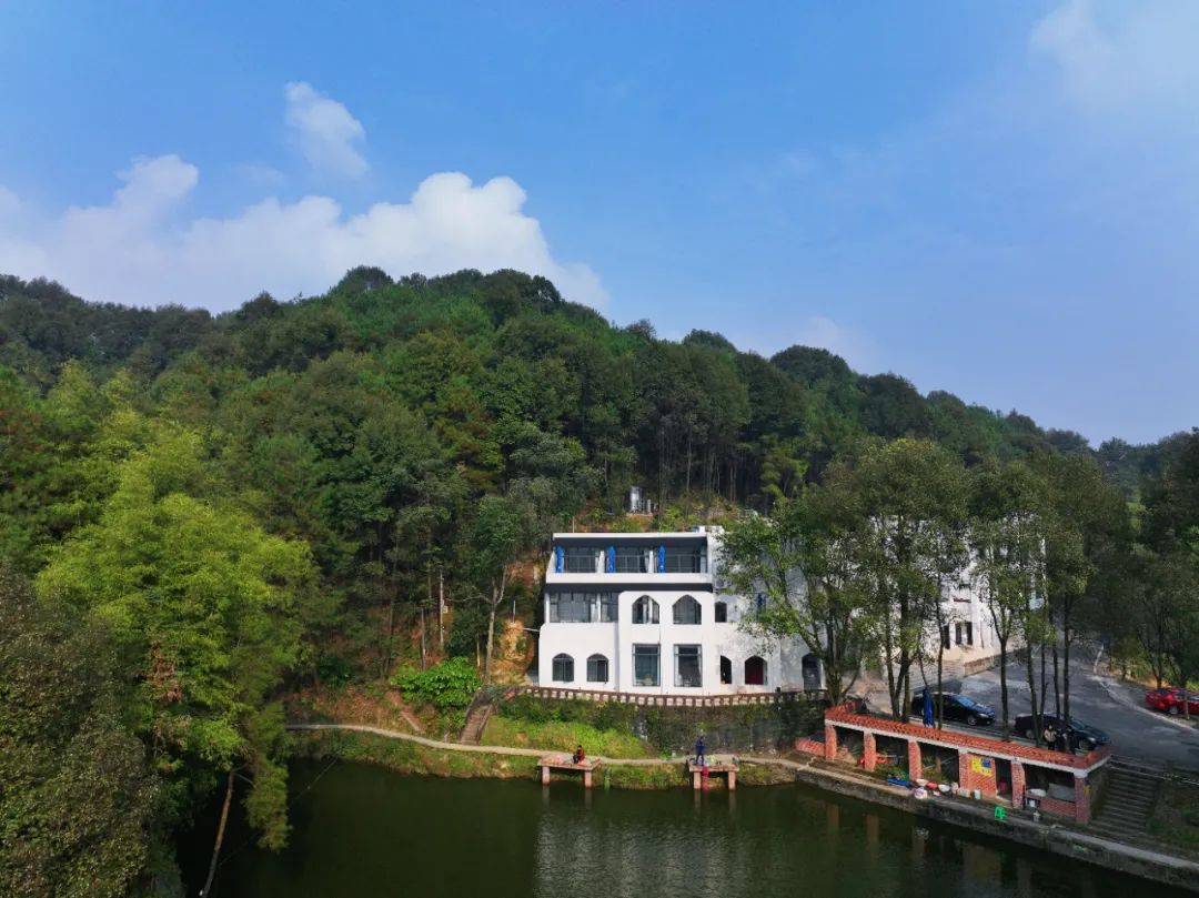 民宿总占地面积500余亩,拥有森林、梯田、溪流、湿地,小池多种景观。整体布局倚山而势,掩映着数栋白色建筑。以巴渝民俗为底色,延续着古村落的历史气韵,将坡地民宿、森林餐厅、沉浸式花园、雅集美学、森林营地等空间植入其中,让当代美学和传统生活方式不露声色地融合。
