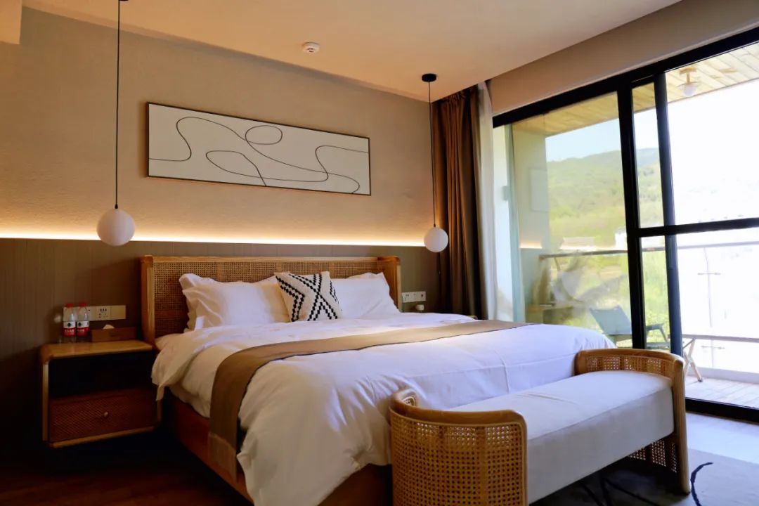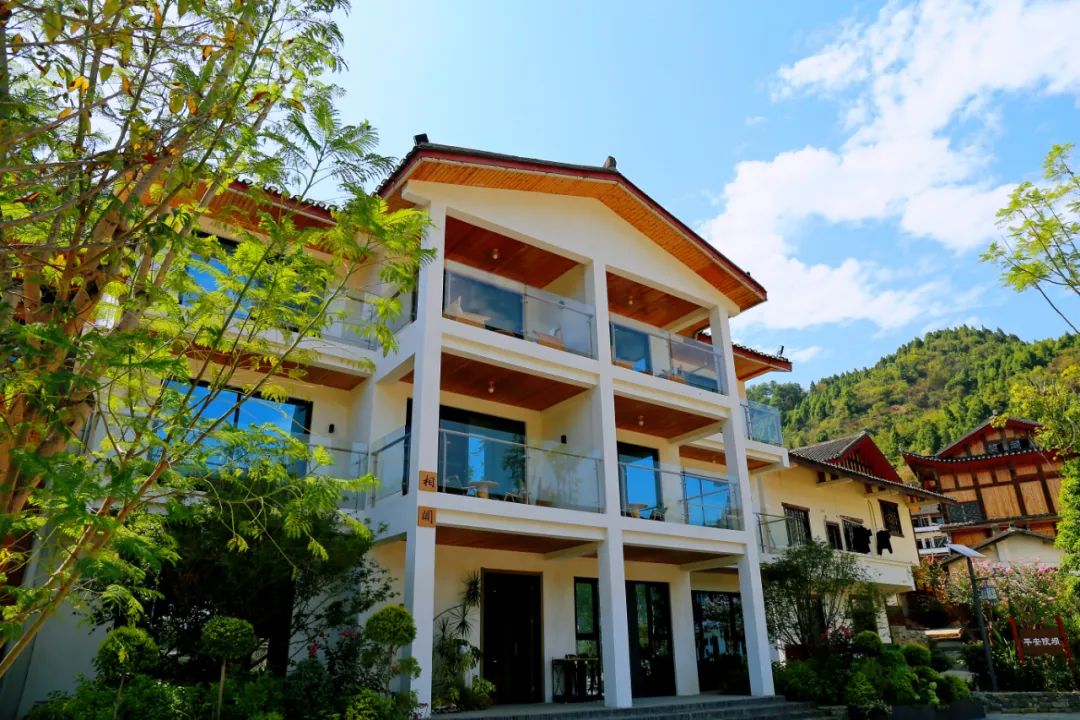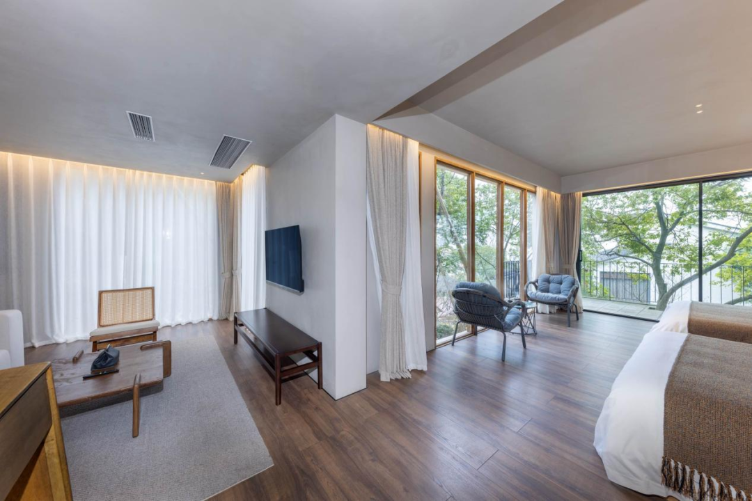 民宿外建筑白墙小青瓦,体现民宿质朴自然的风格,室内营造原木自然风,体现诗意烂漫的东方美学,实是“大隐于市”的当代“隐居”生活,承载着人们对东方乌托邦的美好遐想。