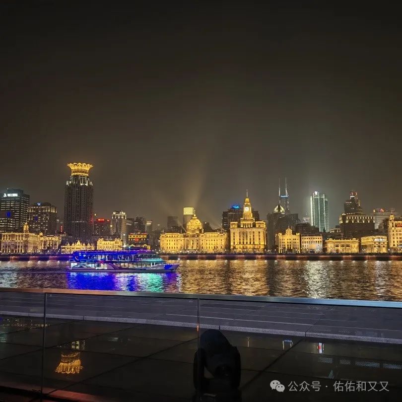 沿着人行道慢慢行走途中,华灯初上,整个外滩仿佛变成了镶嵌在黄浦江畔的一颗璀璨的星星,闪着她独特的光芒。这我想起了来之前看到的一段话:总要来趟上海吧,吹吹黄浦江的晚风,走走武康路,看看东方明珠,感受一下魔都的魅力!在这时候这段话显得特别应景。