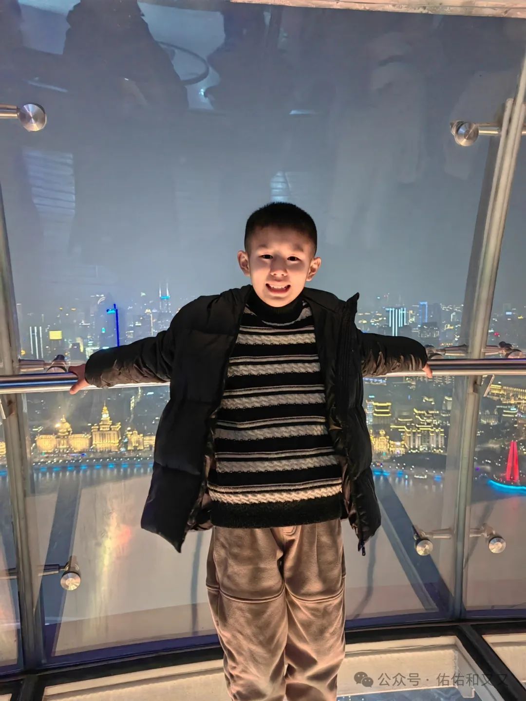1、我们先坐电梯直达263米的主观光层位置,然后走楼梯下去到259米的全透明悬空观光廊。259米的360度全透明玻璃步道透过脚下的透明玻璃,可以一览无余地俯瞰黄浦江两岸的全景。但是一开始走上去我跟儿子还是有点怕怕的。