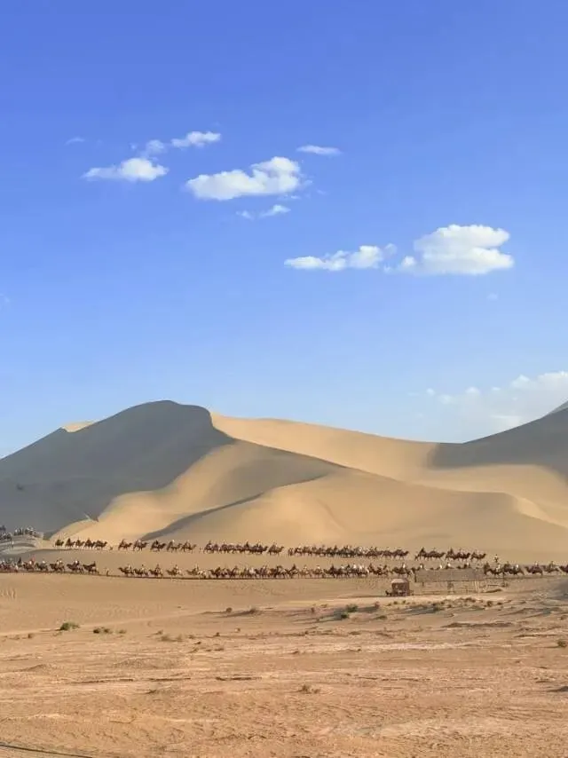鸣沙山月牙泉,包含着甘肃的壮阔,黄沙连绵起伏,风吹过沙丘留下柔和的纹路,一弯清泉镶嵌在沙海当中,千年不干涸, 骑上骆驼走在沙脊上,落日把影子拉得很长,满是西北的苍凉和诗意。