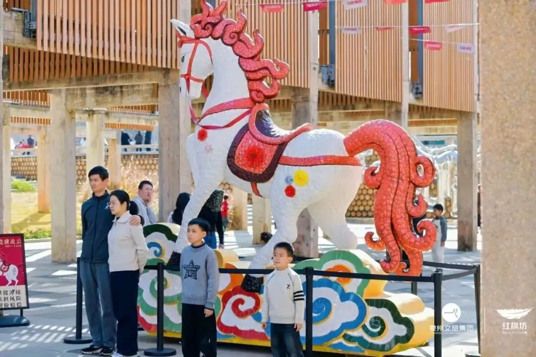 红旗坊秉持“修旧如旧”理念,保留老烟囱、老窑炉等工业肌理,结合马年IP“瓷骥凌云”及羽白市集好物,打造出艺术气息浓郁的文旅新地标,吸引了大量自驾游客专程“打卡”。