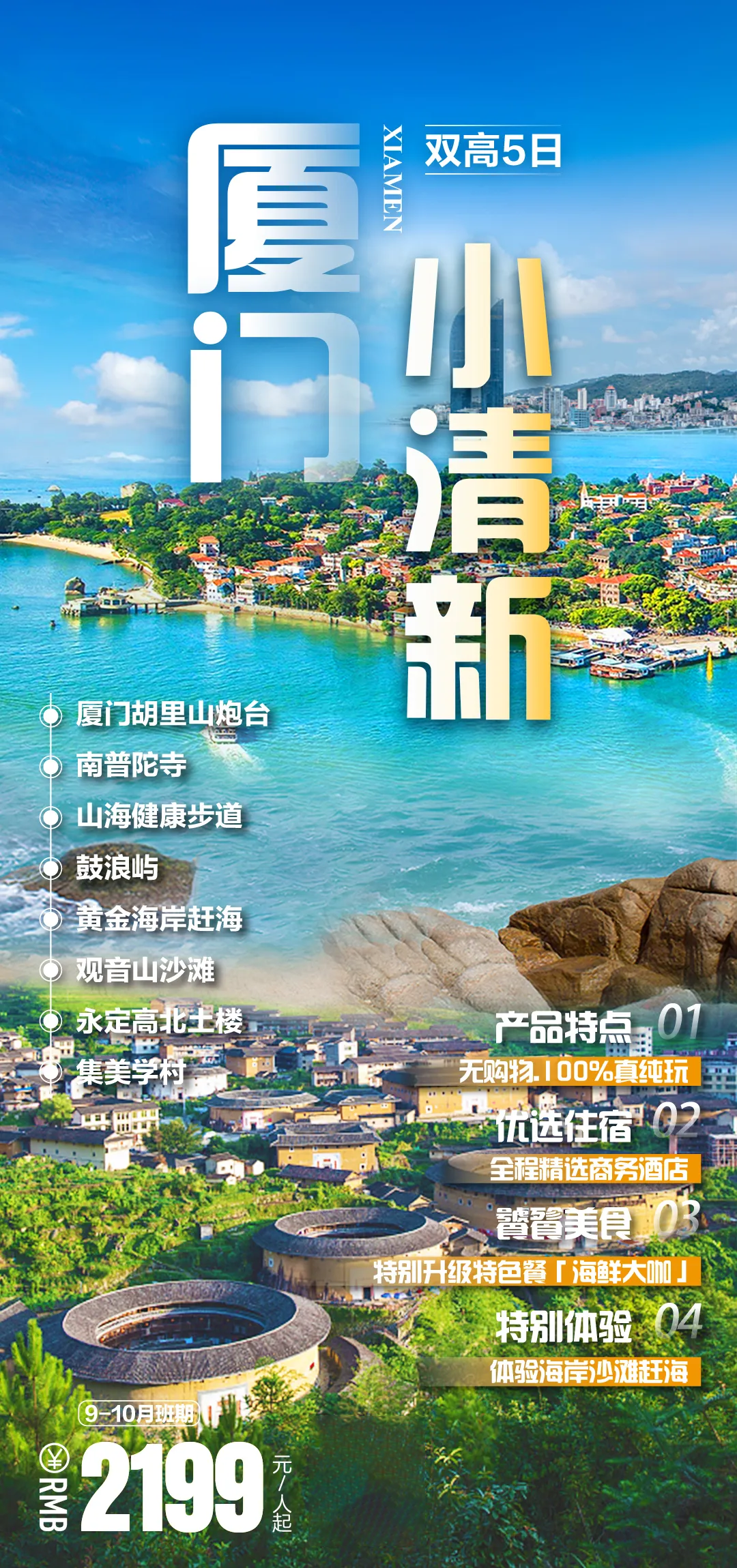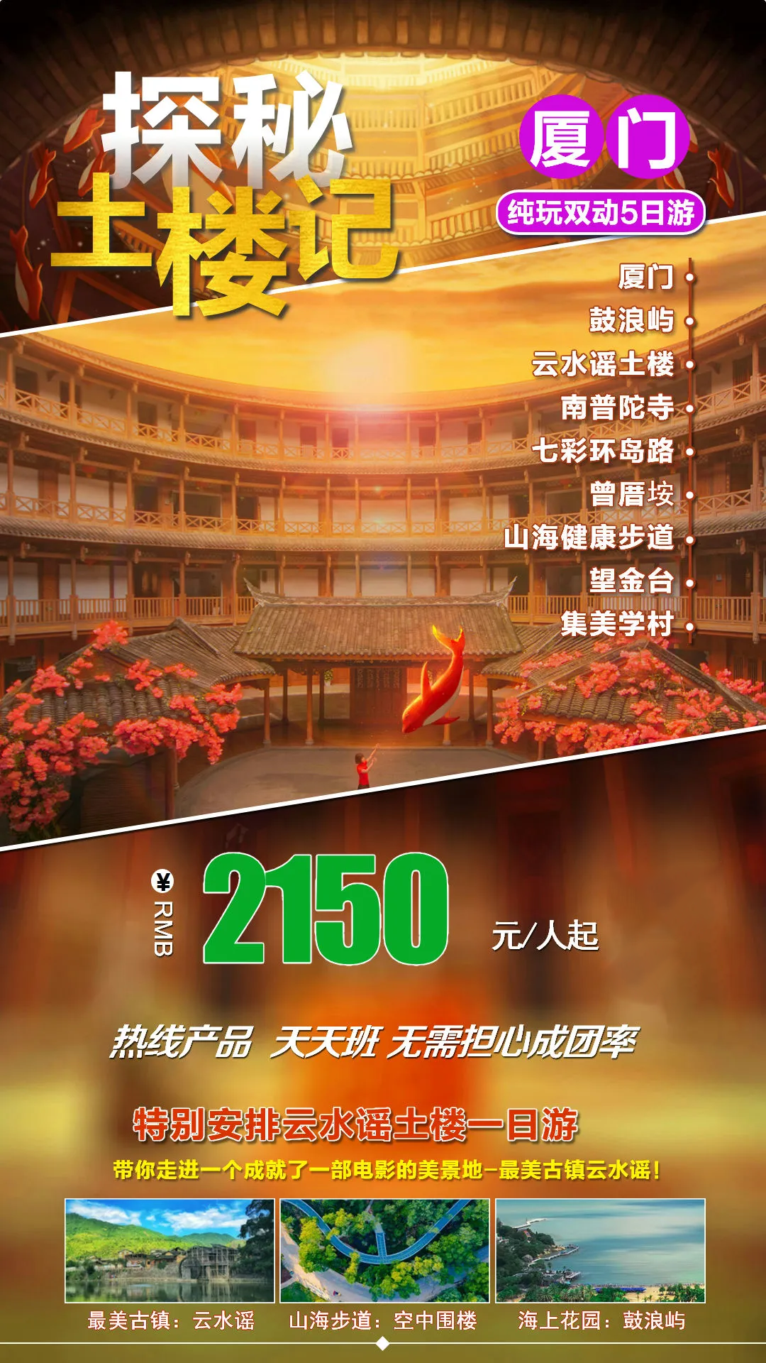 1、热线1人铁发-【厦门&探秘土楼记】¥2150纯玩双动5日游,0自费0购物•厦门趣味赶海•鼓浪屿•南普陀•曾厝垵•云水谣土 《《《点击看详情 |