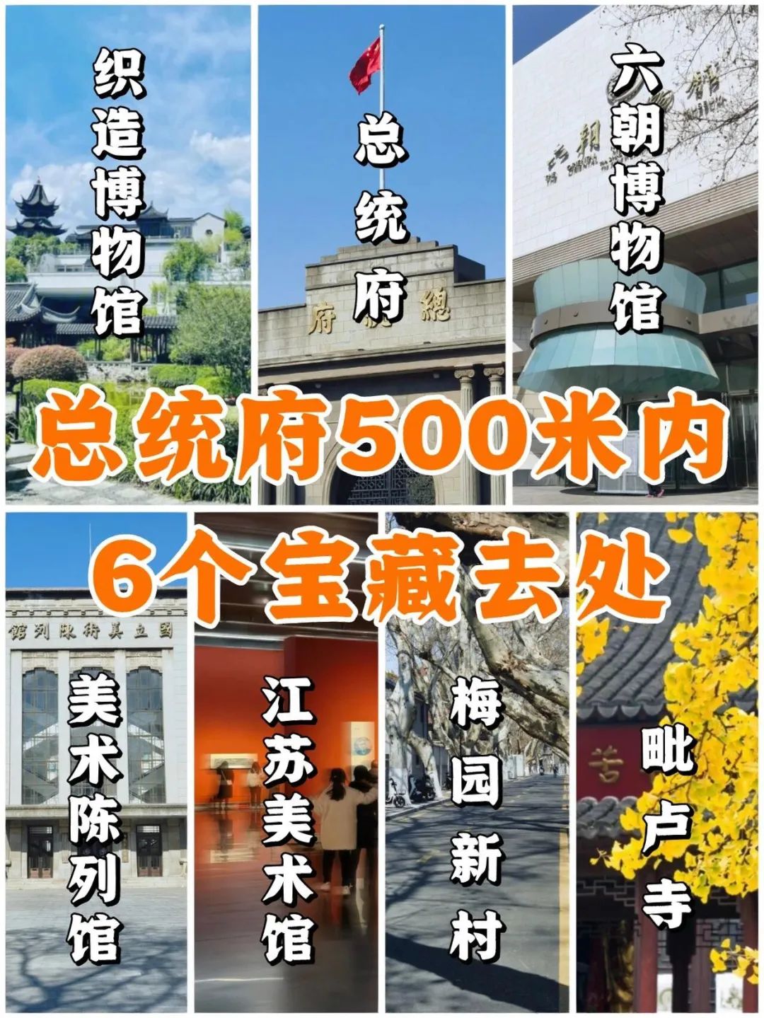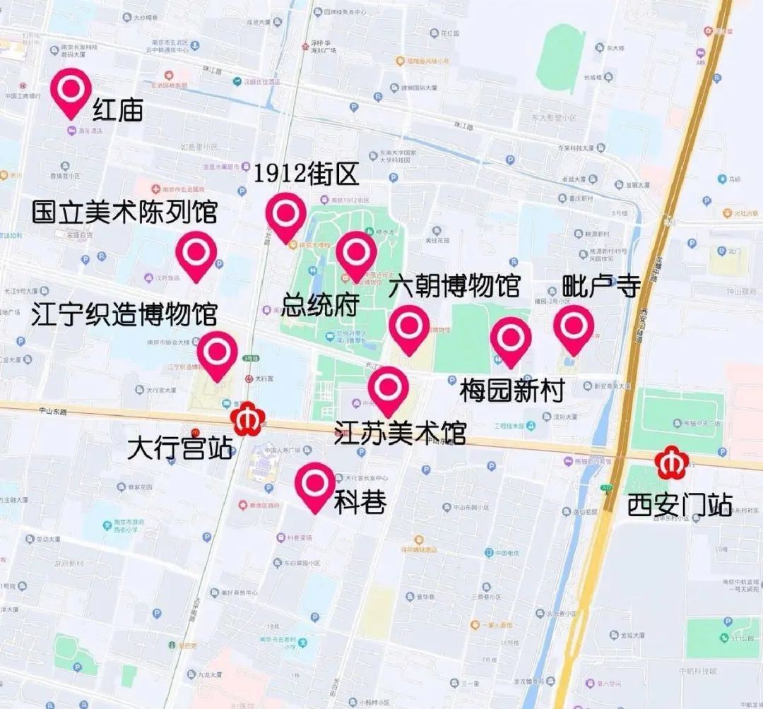 总统府周边算是南京的文化中心,方圆500米内聚集了众多宝藏去处。除了1912街区、省图书馆之外,下面这6个人少好玩的打卡点,赶快收藏打卡去吧!南京总统府是中国近代建筑遗存中规模最大、保存最完整的建筑群,也是南京民国建筑的主要代表之一,中国近代历史的重要遗址。门票40元,学生半价。六朝博物馆是中国展示六朝文物最全面的遗址博物馆,也是反映六朝文化最系统的地方专题性博物馆。经典的贝氏建筑,遗址及文物。馆藏以近现代美术作品为主,兼及古今中外,规划以收藏"新金陵画派"代表画家的作品为重中之重。现有各类藏品近万件,其中以中国画最为丰富,包括明吴门画派、 清初四王、金陵八家、扬州八怪、海上画派、新金陵画派以及20世纪诸名家的作品。此外,还收藏大量版画、中国油画、中国水彩画、当代书法、民间艺术等美术作品。中共代表团梅园新村纪念馆,建立于1954年,位于江苏省南京市城东长江路东端的梅园新村街道两侧。纪念馆由中共代表团办事处旧址、国共南京谈判史料陈列馆、周enlai铜像、图书馆等组成。毗卢寺乃“金光明道场”,秉金光明精神,庄严国土,弘宣圣教,于金陵佛都独具特色。江宁织造博物馆是在清代江宁织造遗址上建造的一座现代博物馆,由著名建筑学家、两院院士吴良镛先生担纲设计,占地面积1.87万平方米。江宁织造博物馆常设江宁织造展厅、云锦天衣展厅、红楼梦曲展厅、中国旗袍展厅,还设有红楼影院、时尚发布中心、红楼剧场、曹府戏苑等展演和服务设施,融文化学习、娱乐休闲于一体,是展示江宁织造、南京云锦及《红楼梦》历史和文化的新型博物馆。国立美术陈列馆主楼建筑四层,立面呈“山”字形,国立美术陈列馆有3个大展厅,每个展厅550平方米,展线160米;4个小展厅,每个展厅170平方米,展线35米;展线高度均为3.3米。国立美术陈列馆大门为立柱式三开间大门,大门内东、西两侧各设有一座正方形平顶警卫室。大楼坐北朝南,主体4层,两翼3层,左右对称。编辑|邓欣璐 审核|孔子豪