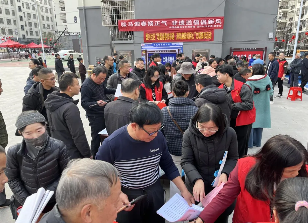 近日,兴国县国兴社区文明实践广场洋溢着喜庆祥和的新春气息,“我在文明实践站过大年”——2026年“情暖社区迎新春 非遗传承润民心”文化惠民活动在此举办。