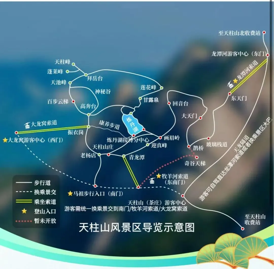 线路一:龙潭河索道上→东关玻璃栈道→鹊桥→天狮峰→大天门→东关悬空栈道→蜒蚰石观景台→回音台→覆盆峰→画眉岭→炼丹湖→康养步道→振衣岗→高奔台→神秘谷→天池峰→百步云梯→振衣岗→大龙窝索道下(游览时间:5-6小时)
