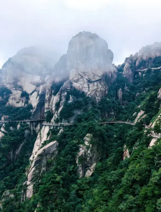 “东关险,西关秀。”下了索道走上东关栈道,视野一下子打开——天狮峰在云雾里若隐若现,像一幅会动的水墨画;穿过大天门时抬头,两座山崖夹出一线青天,阳光从缝隙里洒下来,斑驳地落在石阶上;回音台前停下来喊一嗓子,声音在山谷里荡几个来回,莫名很治愈;走到覆盆峰附近,眼前是层层叠叠的山峦,远的淡青色,近的染着春日里的暖阳。