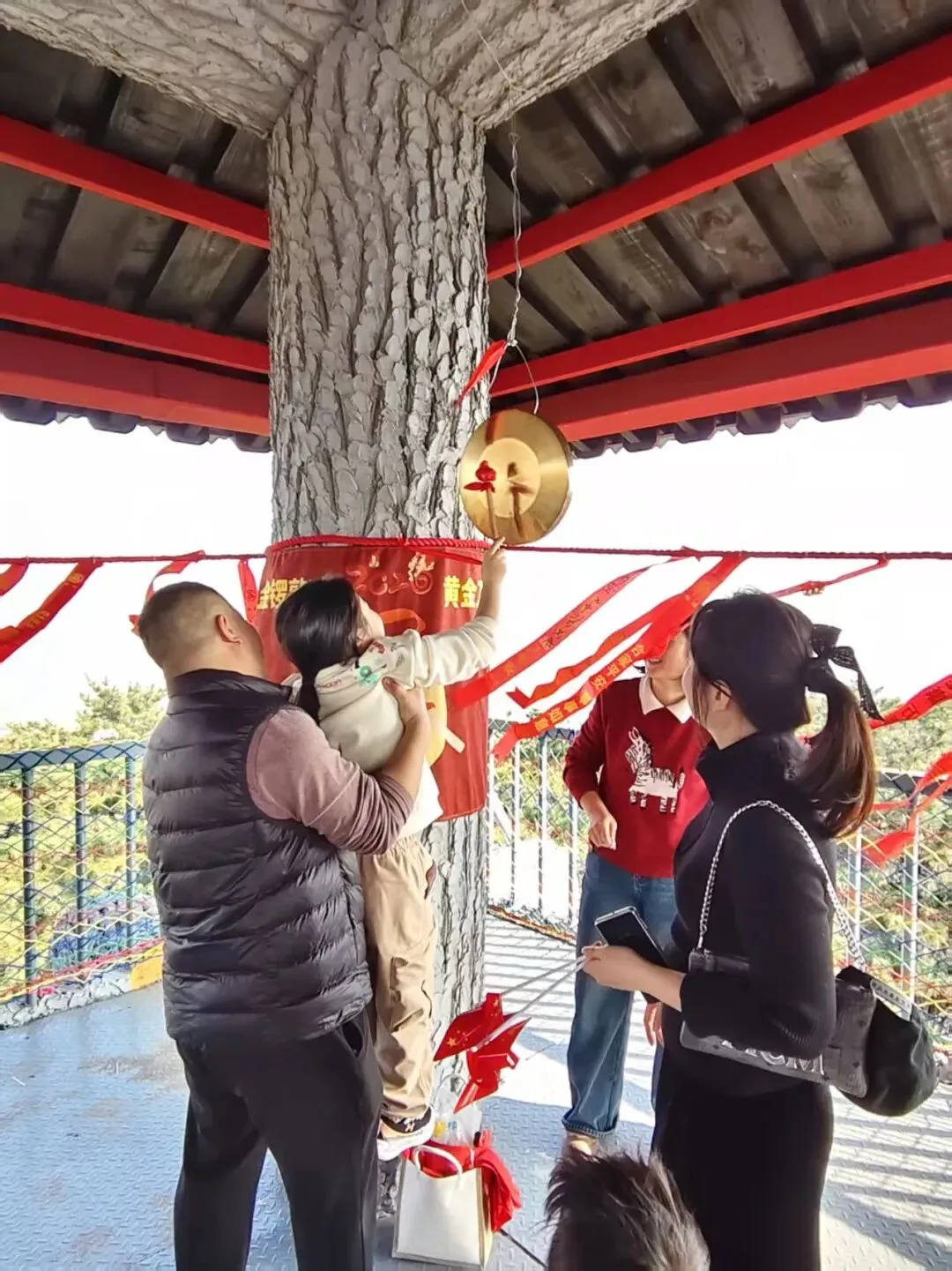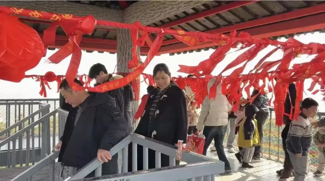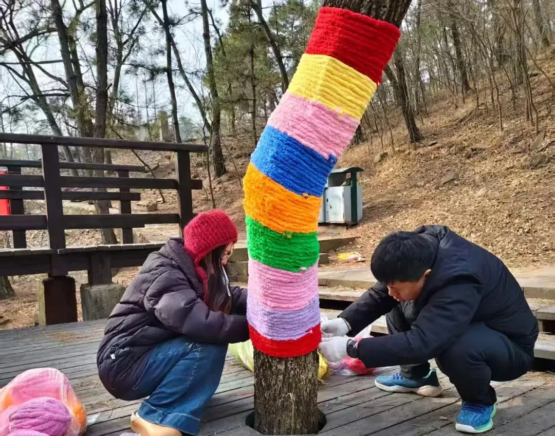 大家齐心协力用五彩毛线为树干裹上温暖新装,童趣满满、温情十足。扇形平台设置马年定制打卡板,林间悬挂暖心标语,成为游客拍照打卡的热门点位,定格新春美好瞬间。