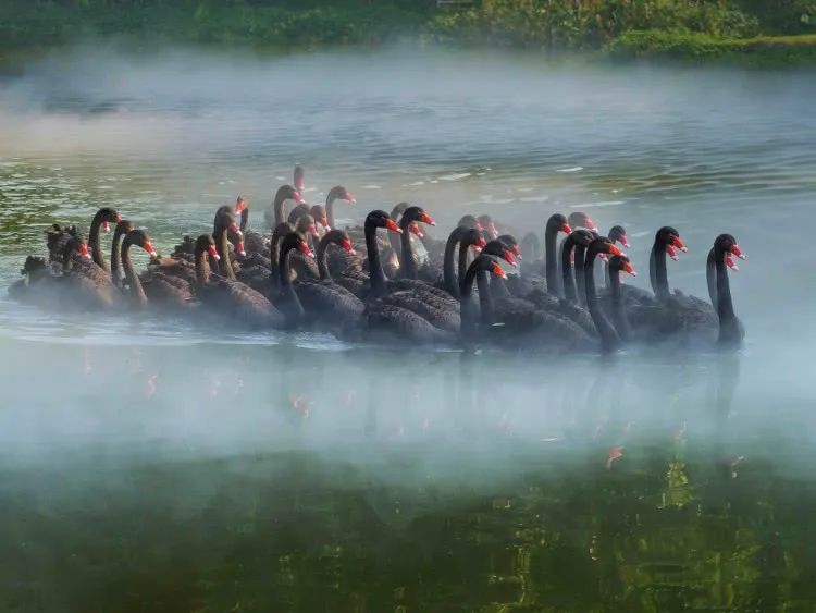 黑天鹅澳大利亚的国鸟之一,飞翔的姿态很舒展,长长的脖子伸得笔直,黑色翅膀顶端伴着白色的羽毛,黑白鲜明对比,让展翅飞翔天鹅翩然若仙