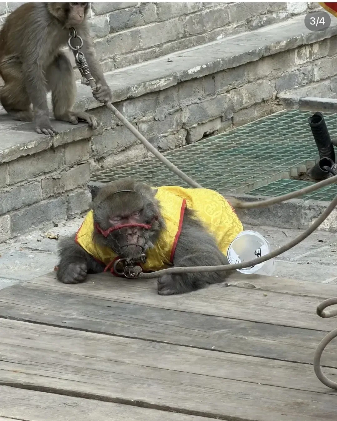 网友发布的图片显示,一只身穿黄马褂的猴子跪在地上,头上罩着黑布,双手被反绑在一根塑料棍上。另有图片显示,一只猴子嘴部套着金属套,脖子上还拴着一根长长的绳子,现场有不少观众围观。不少网友表示,表演画面令人不适,涉嫌虐待动物。