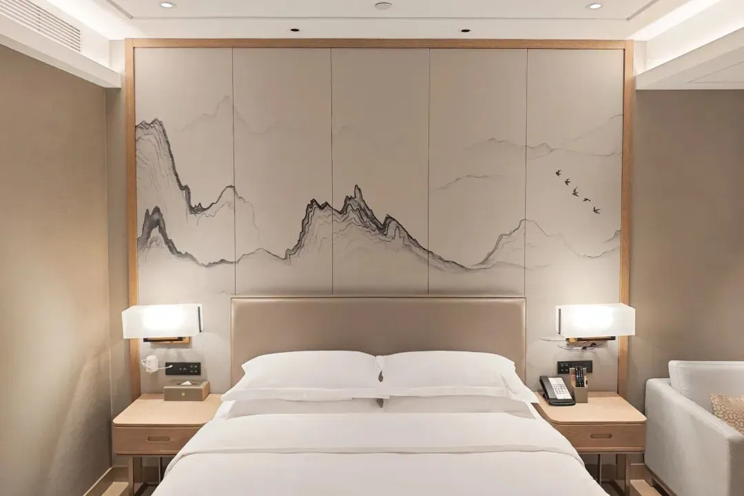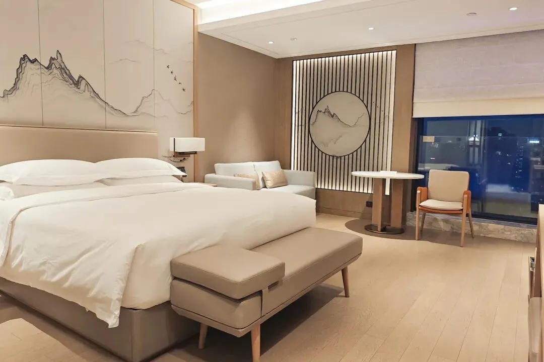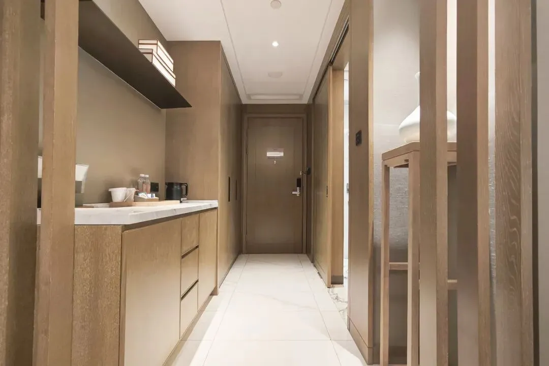 原本预定的是高级大床房,出发前还担心太商务,结果办理入住后直接被惊喜到。设施蛮新的,房间宽敞,约40平左右。整体设计是融合了南宋文化的新中式表达,完全避开了传统国风酒店的老派油腻,也不会有纯简约风的单调感,木质家具与格栅组合,搭配淡雅的软装,色调柔和又温馨,兼顾宋韵文化与现代旅居的实用性。