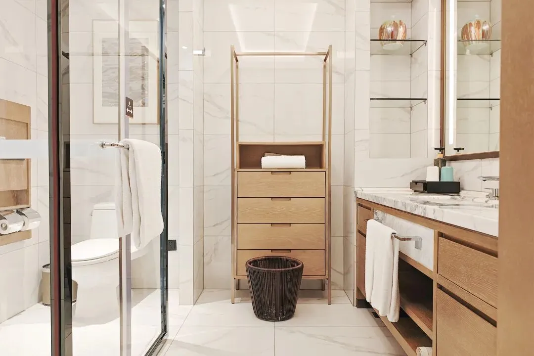 进门左侧的卫生间淋浴区用高透玻璃隔断独立出来,马桶与洗漱台分置,避免淋浴后全屋潮湿,动线清晰;整体空间宽敞不局促,两人同时使用也不拥挤。墙面、地面采用的质感瓷砖,搭配墙面装饰,和客房整体风格统一,高级感强。洗手台的镜面充足且带化妆放大镜,方便护肤化妆。
